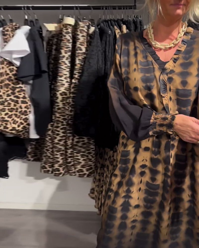 This breezy midi-length dress features a relaxed fit with long sleeves and a gentle v-neckline. The striking ombre pattern blends down the length of the fabric, creating a flowing, vertical effect. Button details at the chest and matching cuffs add a touch of structure to the overall soft, elegant drape of the dress.